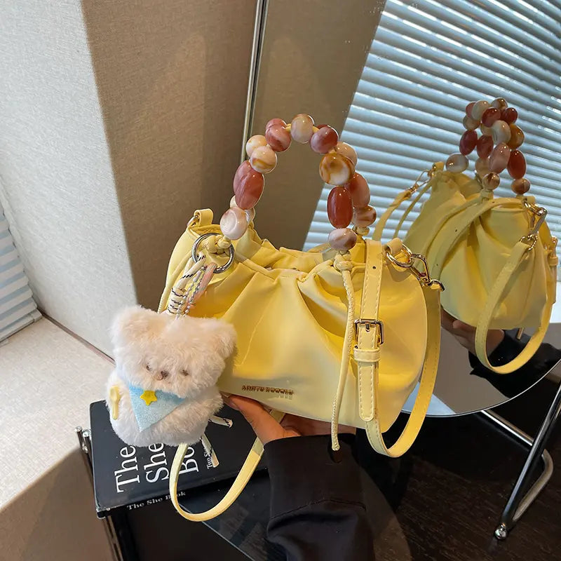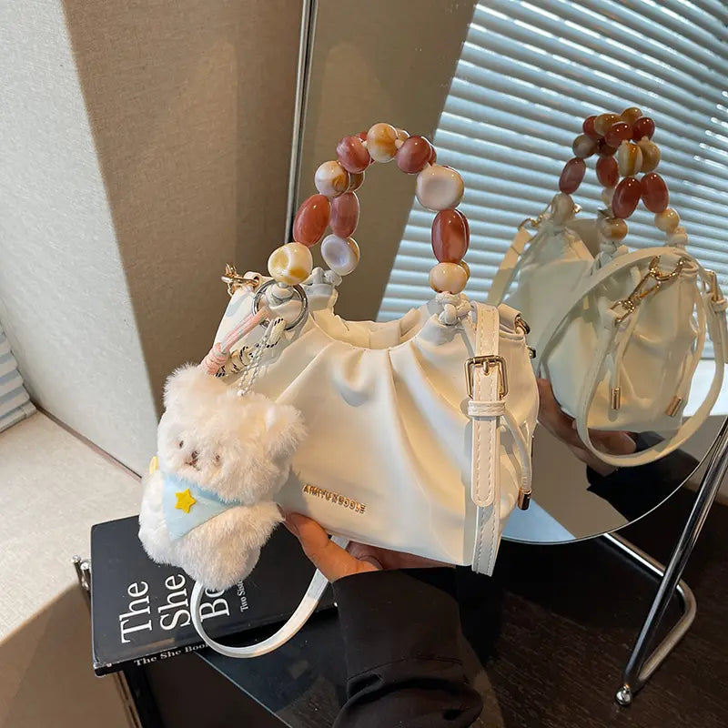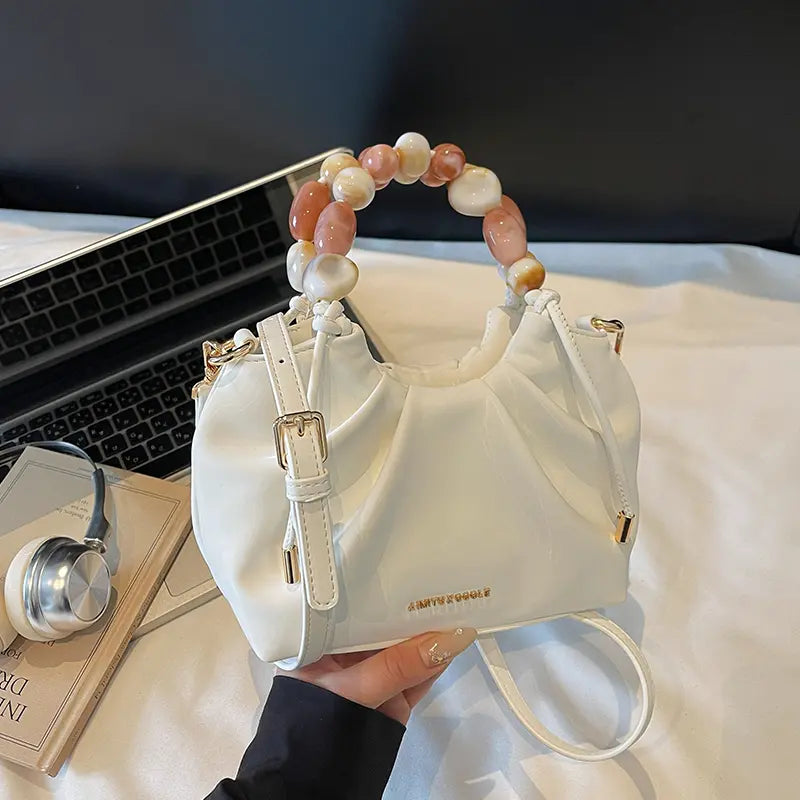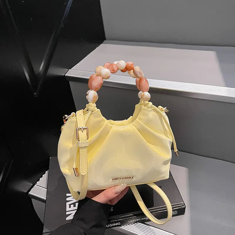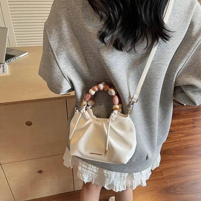 Some days, you just want to step out lightly—cardholder, phone, a touch of lipstick, and a small feeling of being cared for. You lift this pearl-handle mini bucket bag, and the smooth beads roll softly in your palm, scattering tiny sparks of light—quietly holding the day’s sense of ritual in your hand.