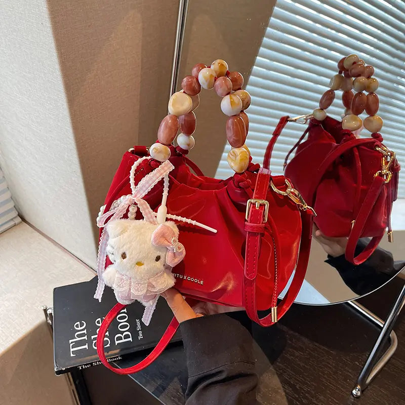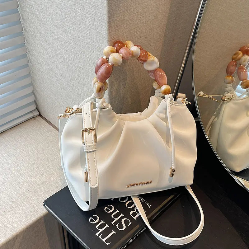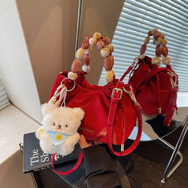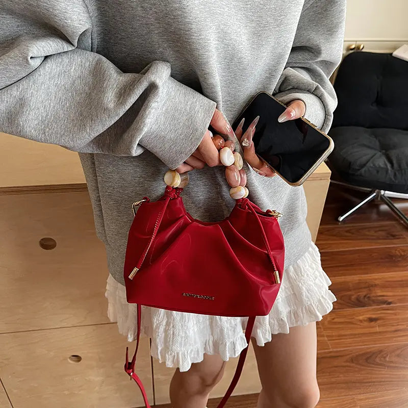 May this pearl-handle glossy mini bucket bag gather your day into calm: with one soft lift, let the light touch your hand, and make even an ordinary day feel tenderly, thoughtfully celebrated.