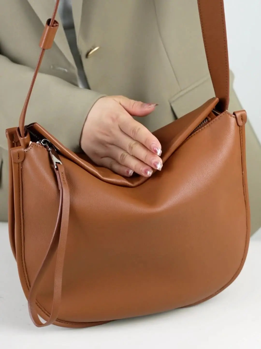 The evening breeze brushes your hair gently behind your ear. You slow your pace just a little, slipping your phone, a book, and a soft sense of calm into your bag. The crescent curve rests naturally against your shoulder— effortless, yet instantly refining your whole look.